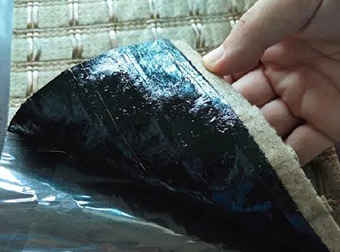 (3) 在-5℃施工時(shí),傳統(tǒng)的防裂布由于噴灑出的熱粘層油迅速冷卻,失去黏附性能,無法與路面粘結(jié)。自粘式應(yīng)力布耐低溫,可以在-5℃時(shí)進(jìn)行正常施工,依然保持良好的黏附性,與路面有效的粘結(jié),解決了現(xiàn)有的防裂布季節(jié)性施工難題;